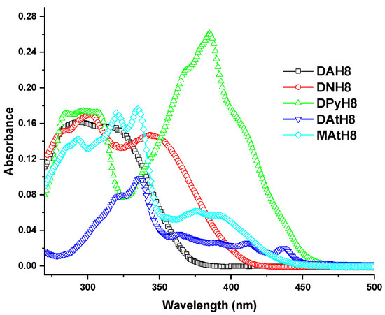 UV-Vis spectra of the azomethine dimers (DArH8) and model compound (MAtH8) containing eight methylene groups in the flexible spacer, in DMF solutions.