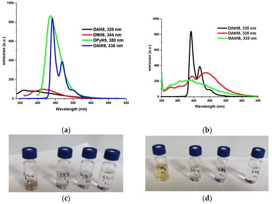 The photoluminescence properties of the studied dimers were investigated by excitation at the maximum absorption wavelengths characteristic of the chromophore-imine frame. The dimers containing phenyl or naphthalene moieties presented a broad emission band in the UV and violet domains, respectively, while the dimers containing pyrene units showed a sharp emission band in the blue domain (Figure 6a). The photoluminescence spectra of the anthracene-containing dimers showed superposed emission bands, indicative of less electron delocalization leading to more fluorophore units [56,58]. Thus, the DAtH9 dimer and the MAtH8 model compound presented a broad emission band with four peaks in UV, violet, blue and green domains, while the DAtH8 dimer showed a sharp emission band with three maxima: The first two in the blue domain and the last one in the green domain (Figure 6b).