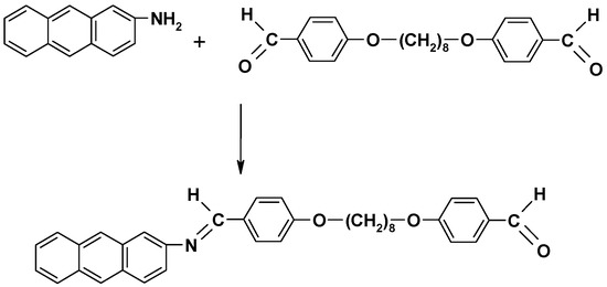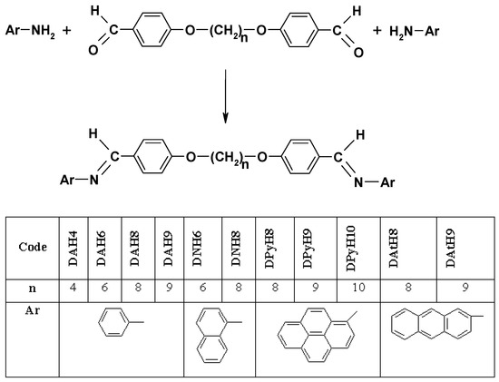 Aniline, 1-naphthylamine, 2-aminoanthracene, 1-aminopyrene and N,N-dimethylformamide were purchased from Sigma-Aldrich Chemie GmbH (Germany) and used as received. α,ω-bis(4-formylphenoxy)-alcanes: (1,4-bis(4-formylphenoxy)-butane; 1,6-bis(4-formyl phenoxy)-sextane, 1,7-bis(4-formylphenoxy)-heptane, 1,8-bis(4-formylphenoxy)-octane, 1,9-bis(4-formylphenoxy)-nonane, 1,10-bis(4-formylphenoxy)-decane) were prepared and structurally characterized in our laboratory according to published procedures [51,62].