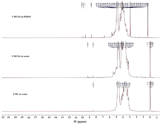 Proton nuclear magnetic resonance (1H NMR) spectra for CMC dissolved in water, CMCOx dissolved in water, and CMCOx dissolved in DMSO.