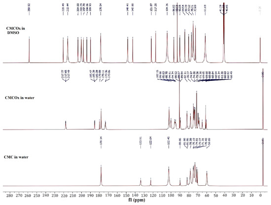 Carbon-13 nuclear magnetic resonance (13C NMR) spectra for CMC dissolved in water, CMCOx dissolved in water, and CMCOx dissolved in DMSO.