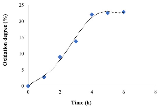 For the oxidation degree determination, a volume of 100 mL of CMC solution of 3% concentration (w/v) was prepared, and the working protocol was described in the Section 3.4. It was found that the oxidation degree gradually increased up to 4 h when it reaches the value of 22.11%, after which it was practically stabilized, reaching the value of 22.9% after 6 h. Consequently, partial oxidation was achieved, which was our demand, because advanced oxidation can result in oxidation of carbonyl groups to carboxylic groups and, possibly, the polysaccharide chain degradation with a drastic reduction of the molecular weight. The number of moles of aldehyde groups varies, and it was between 0.71 × 10−3 and 5.86 × 10−3 moles CHO/g of CMCOx. Similar results were found and reported in the literature, where it was shown that the aldehyde groups’ number increases over time in the oxidation reaction [31,53].