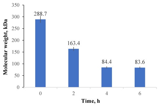 The oxidation process consequences on the CMC average molecular weight were evaluated. Three samples were obtained by varying the oxidation reaction time (between 2 and 6 h). The reactants’ amounts were maintained constant (1 g of NaIO4 and 1 g of CMC) in each synthesis. There was a significant reduction in CMC’s molecular weight with increasing oxidation time due to polysaccharide degradation. The results obtained are consistent with the results obtained by Eremeeva and Bykova [54].
