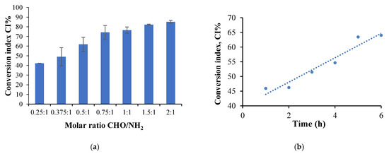 To determine the influence of cross-linking time and temperature on CI (more precisely, on CIchemical cross-linking and physical interactions), sample P2 was selected because the CI has a medium value, and the influence of these parameters could be studied. Six hydrogel films were prepared to evaluate the cross-linking time influence in which all reaction conditions were kept constant, and only the cross-linking time was varied between 1 to 6 h. The amino groups’ CI variation as a function of the cross-linking time for the P2 sample is shown in Figure 8b.