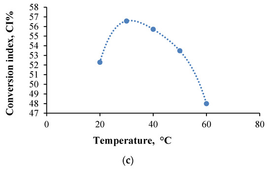 Six other films were obtained to evaluate the cross-linking temperature influence on the CI at different cross-linking temperatures between 20 °C and 60 °C, maintaining the other conditions constant as it was described in Materials and Methods. Figure 8c shows the CI variation as a function of the cross-linking temperature for the films obtained.