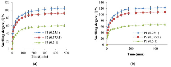 The variation in time of the swelling degree for P1, P2, and P3 samples using different molar ratios in two solutions of different pH: (a) pH = 5.5 and (b) pH = 7.4.