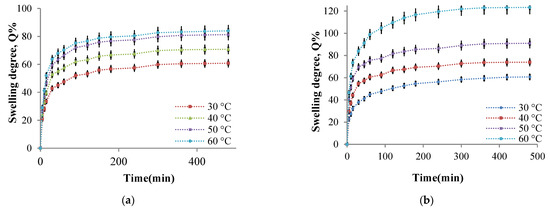 The analysis of Figure 10a allows us to ascertain that the films can absorb water at pH = 5.5, and the swelling degree values depend on the cross-linking temperature. The swelling was instantaneous when the obtained samples were immersed in aqueous solutions, and the polymers’ strong hydrophilic character determined it. At the same time, the presence of amine groups that were protonated in a weak acid medium leads to electrostatic repulsions between the ammonium cations formed, the effect being the distance of the chain segments between the cross-linking nodes and, consequently, the diffusion of an increased water amount into the polymer network. The swelling degree increases rapidly in the first hour and then slower in the time interval range of 1–3 h with a tendency to reach equilibrium after 8 h. The swelling degree depends on the cross-linking temperature at which the hydrogels are obtained. In agreement with the CI evolution, the cross-linking temperature increase after 30 °C determines the decrease of CI values and a higher swelling degree value (Figure 10). Because there are strong physical interactions between the CS chains (responsible for the amino groups’ partial blocking that can no longer react with ninhydrin), it could be concluded that these physical interactions act as an additional cross-linking. These interactions decrease in intensity as the cross-linking temperature increase (see Section 2.2.3), and the swelling degree values in the aqueous solutions increases. For the samples prepared at different cross-linking temperatures, the same swelling degree evolution in time was recorded in the films immersed in weakly basic aqueous solution at pH = 7.4 (Figure 10b). Still, the swelling degree values obtained at this pH were superior to those obtained at pH = 5.5.