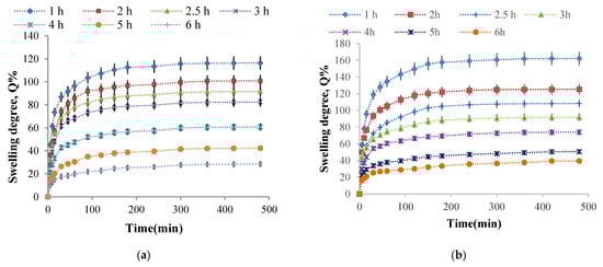 Variation in time of the swelling degree for P2 sample obtained at different cross-linking times in different pH solutions: (a) pH =5.5 and (b) pH = 7.4.