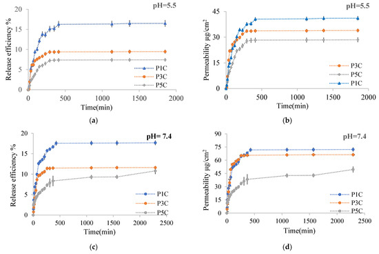 It was found that the curcumin encapsulation efficiency decreases as the CMCOx amount in the films increases, consequently as the cross-linking degree increases. This effect was determined because the polymer network meshes became smaller when the cross-linking density increased, and the curcumin amount that could diffuse into the cross-linked polymeric matrix was lower.