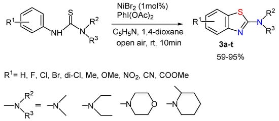Very recently, Ni(II) salts were shown to be very good catalysts for the same reaction [44]. The method is more advantageous as it uses a cheaper and less toxic catalyst in a much lower concentration, and the reaction is carried out under mild conditions in a very short time resulting in up to 95% product yield (Scheme 3). The method can be applied to N-arylthioureas containing both electron-donating or electron-withdrawing substituents in the benzene ring and is scalable without any loss of the yield, which makes it promising for industrial application.