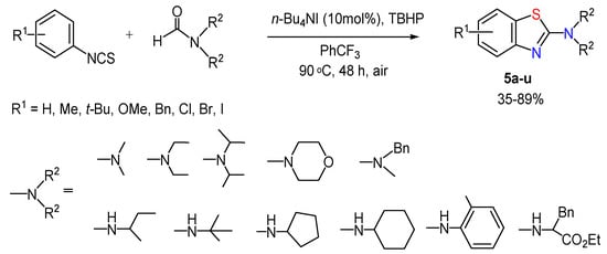 The metal-free reactions of sulfanylation of the C–H bond are most appealing and in line with the principles of green chemistry. Isothiocyanates are universal building blocks used to synthesize various heterocyclic ensembles, mostly triggered by nucleophilic addition. A convenient synthesis of 2-aminobenzothiazoles 5a–u from readily available arylisothiocyanates and various formamides was reported (Scheme 5) [46]. The reaction was assumed to proceed as decarbonylation of formamide under the action of n-Bu4NI and t-BuOOH (TBHP) and formation of the aminyl radical, its addition to the isothiocyanate and subsequent cyclization of the S-centered radical intermediates. The yield is strongly affected by the nature and the position of the substituent in the phenyl ring.