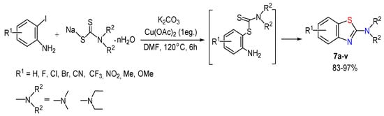 A simple and effective one-pot synthesis of 2-aminobenzothiazoles 7 from 2-iodoanilines and sodium dithiocarbamates by the Ullmann-type reaction (CAr–S bond formation via the intermediate copper thiolate) was developed with the yields of the products reaching 97% (Scheme 7) [48]. Cu(OAc)2/Cs2CO3/DMF/120 °C was found to be the best combination of the copper(II) catalyst, base, solvent, and temperature. The electron-donating or withdrawing properties of the substituents in the ring do not affect the products’ yield, reaching 97% for 2-iodo-4-fluoroaniline. The method employs readily available reagents, inexpensive ligand-free catalyst, provide good yields of potentially biologically active compounds and, therefore, is practically valuable.