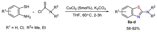The formation of 2-aminobenzothiazoles 8a–d is possible also by one-pot condensation of aminothiophenols with thiocarbamoyl chloride in the presence of CuCl2 and K2CO3 proceeding under mild conditions in good yields (Scheme 8) [49].