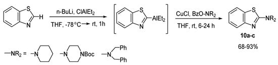 An alternative route to 2-aminobenzthiazoles is direct aluminum organic synthesis shown in Scheme 10 [52]. The intermediate organoaluminum compound formed by lithiation/alumination of benzothiazole reacts with O-benzoylhydroxylamines. The copper-catalyzed reaction proceeds in one pot under mild conditions in up to 93%.