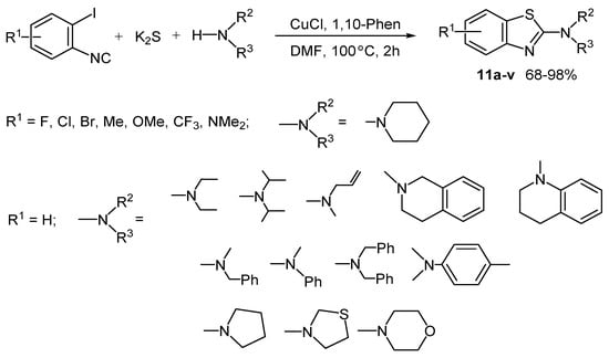 The three-component copper-catalyzed reaction of 2-iodophenylisocyanides, potassium sulfide and various amines was shown to give biologically interesting 2-aminobenzothiazoles in up to quantitative yield (Scheme 11, the optimal conditions obtained by screening of the alkali metal, catalyst, solvent, and temperature are given) [53].