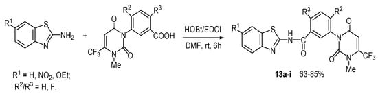 Acylation of 6-substituted 2-aminobenzothiazoles by polysubstituted benzoic acids containing the uracil moiety affords benzamides 13a–i possessing herbicide activity (Scheme 13) [40].