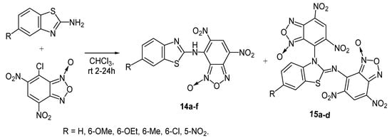 Alkylation of 2-aminobenzothiazoles is possible by highly reactive halogenides, such as, e.g., 7-chloro-4,6-dinitrobenzofuroxane having two strong activating nitro groups [19]. First, the primary amino group is alkylated to give the monoalkylated products 14a–f, which after tautomerization give the dialkylated products 15a–d (Scheme 14). Remarkably, for the substrates containing electron-withdrawing substituents (6-Cl, 6-NO2), the dialkylation products were not formed. It was noted that in time the monoalkylated product became the major one. The obtained compounds were shown to have antimicrobial activity and also can be used as luminescing biosensors.