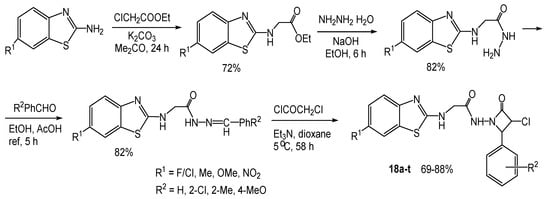 6-Substituted 2-aminobenzothiazoles prepared in the same manner were treated first with ethyl chloroacetate and then with hydrazine hydrate to afford the corresponding acetohydrazides. The latter’s condensation with aldehydes led to benzylideneacetohydrazides, which after acylation with chloroacetyl chloride gave acetamides 18a–t (Scheme 17). The products were tested for the anticonvulsant effect, and those containing electron-withdrawing groups (Cl, F, NO2) in the benzothiazole ring and unsubstituted or chlorine-substituted in the benzene ring were found to be more active [28].