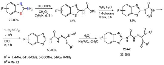 Very recently, starting with acylation of the ring-substituted 2-aminobenzothiazoles, and followed by hydrazinolysis, thioetherification with carbon disulfide and oxidation, a large family of bis-sulfoxide derivatives 26a–x containing the acylhydrazone and the benzothiazole groups have been synthesized (Scheme 22) [56] and shown to possess antibacterial activity.