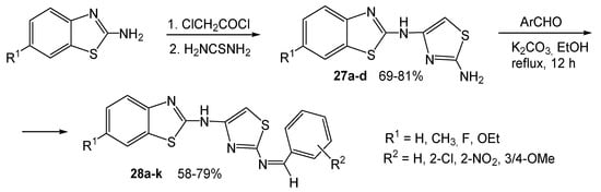 A similar approach was earlier used to synthesize heterocyclic amines 27a–d and their Schiff bases 28a–k [17]. Acylation with chloroacetyl chloride followed by cyclization with thiourea to form the second 2-aminothiazole moiety and condensation of the amino group in amines 27a–d with aromatic aldehydes led to the target azomethines 28a–k in moderate yields (Scheme 23). The products were tested on the biological activity, and both amines 27a–d and the Schiff bases 28a–k showed high or even maximum antibacterial, antifungal and anthelminthic activity. Electron-donor groups (Me, OEt) in the 6-position of the benzothiazole ring enhance the anthelminthic effect. The NO2 group in the phenyl ring promotes antibacterial activity. Electron-acceptor F and Cl atoms both in the benzothiazole and the phenyl ring enhance antifungal activity.
