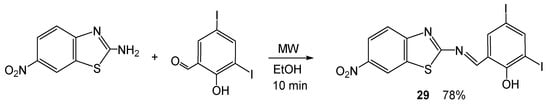 The Schiff base 29 formations between the NH2 group of 2-amino-6-nitrobenzothiazole was performed by the MW-assisted reaction with a 3,5-diiodosalicylic aldehyde in 76–80% yield in 8–10 min (Scheme 24) [57]. For example, without MW irradiation, the yield was as low as 38% after 2 h.