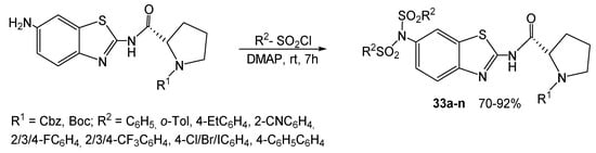A similar ideology was employed to synthesize new benzothiazol-disulfonamide scaffolds 33a–n as a potent hepatitis C virus inhibitor (Scheme 26) [58]. The key intermediate product prepared by the reaction of 6-nitro-2-aminobenzothiazole with proline activated by N-(3-dimethylaminopropyl)-N′-ethylcarbodiimide (EDCl) with subsequent reduction of the nitro group (omitted in Scheme 26) is sulfonylated by arenesulfonyl chlorides at the free amino group. The obtained aminobenzothiazoles have a smaller molecular mass and hydrophobicity concerning the known antiviral agents, which provides better peroral bioavailability.