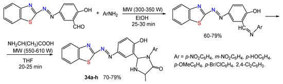 MW irradiation was also used in the synthesis of benzothiazole-imidazolidines 34a–h. The diazonium salt of 2-aminobenzothiazole reacted with a salicylic aldehyde in an alkaline solution to form the azoaldehyde derivative of benzothiazole [15]. The latter was cyclized by condensation with primary aromatic amines under MW-irradiation, and the formed imines were reacted with L-alanine under MW-irradiation in THF to give imidazolidines with benzothiazolyl fragment possessing antibacterial activity (Scheme 27).