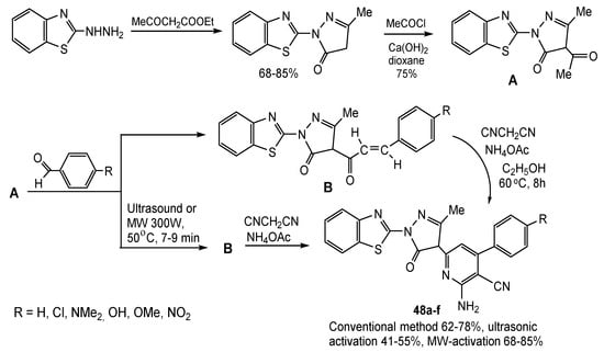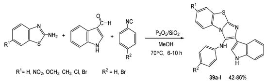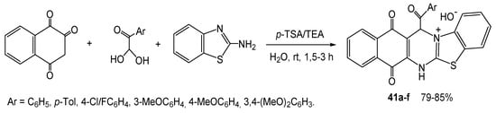 An example of green synthesis is Sc(OTf)3-catalyzed MW-assisted atom-economy three-component reaction of 2-aminobenzothiazole, aromatic aldehydes and 1,3-diketones, leading to annulated products 38 bearing pharmacophore motifs (Scheme 30) [60]. The reaction proceeds as the CO-activation, Knoevenagel condensation reaction, and nucleophilic addition of azole followed by intramolecular cyclization. The advantages of the reaction, such as high product yields, short time, easy isolation of the products and ecologically safe conditions, can be realized only by a combination of Sc(OTf)3 catalysis, MW-assistance, and solvent-free conditions.