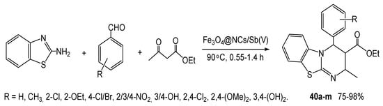 - Hosseinikhah, S.S.; Mirjalili, B.B.F. Fe3O4@NCs/Sb(V): As a Cellulose Based Nano-Catalystfor the Synthesis of 4H-Pyrimido[2,1-b]benzothiazoles. Polycyclic Aromat. Compd. 2020, 1764985. [Google Scholar] [CrossRef]