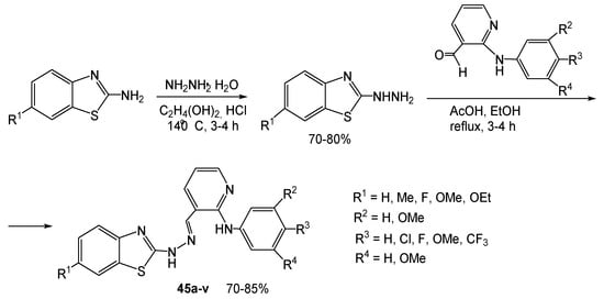 Many researchers were engaged in the search for new families of biologically active 2,5(6)-substituted 2-aminobenzothiazoles. The starting 2-unsubstituted 2-aminobenzothiazoles were obtained from the easily available anilines, potassium thiocyanate and bromine, then acylated by chloroacetyl chloride and introduced in the reactions with various N-heterocycles [7,14,17,20,25,26,27,28,29,31,36,38,39]. Thus, a large benzothiazole-piperazine series of compounds 16a–v was synthesized in three steps (Scheme 15) [25,26]. The compounds demonstrated good antidepressant activity without accompanying negative effects on physical activity.