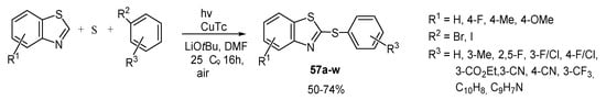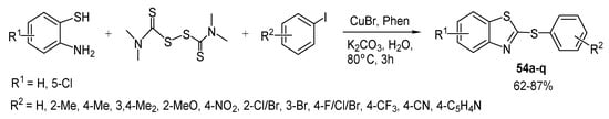 - Liu, X.; Zhang, S.-B.; Zhu, H.; Dong, Z.-B. Copper (I)-Catalyzed Tandem One-Pot Synthesis of 2-Arylthiobenzothiazoles and 2-Arylthiobenzoxazoles in Water. J. Org. Chem. 2018, 83, 11703–11711. [Google Scholar] [CrossRef]