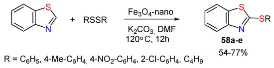 - Rafique, J.; Saba, S.; Frizon, T.E.A.; Braga, A.L. Fe3O4 Nanoparticles: A Robust and Magnetically Recoverable Catalyst for Direct C–H Bond Selenylation and Sulfenylation of Benzothiazoles. Chem. Select. 2018, 3, 328–334. [Google Scholar] [CrossRef]