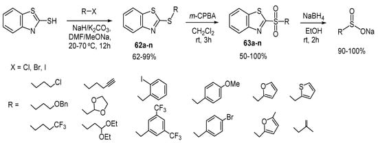 - Tran, C.; Flamme, B.; Chagnesa, A.; Haddad, M.; Phansavath, P.; Ratovelomanana-Vidal, V. A Practical Access to Functionalized Alkyl Sulfinates. Synlett 2018, 29, 1622–1626. [Google Scholar] [CrossRef]