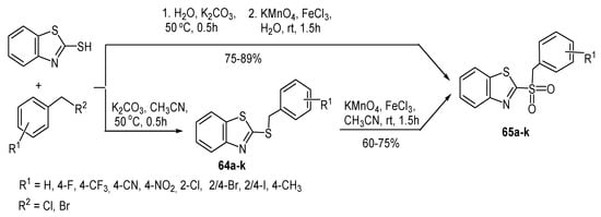 - Ballari, M.S.; Cano, N.H.; Wunderlin, D.A.; Feresin, G.E.; Santiago, A.N. One-pot sequential synthesis and antifungal activity of 2-benzylsulfonyl)benzothiazole derivatives. RSC Adv. 2019, 9, 29405–29413. [Google Scholar] [CrossRef]
