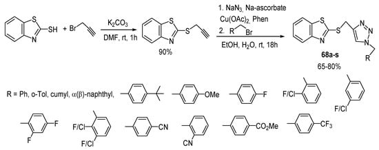 Triazole and isoxazole-tagged benzothiazole/benzoxazole derivatives 35a–c and 36a–g were synthesized as potent cytotoxic agents by multistep synthesis starting from N-propargylation of the Boc-protected 2-aminobenzothiazole, as shown in Scheme 28 [33]. The key intermediate A was converted to the target products, either directly or after deprotection with trifluoroacetic acid, using Cu-catalyzed Sharpless click chemistry concept by the reaction with different amide azides. The presence of various pharmacophores in the synthesized compounds not only enhances the antitumor effect in vivo but also promotes new mechanisms of action.