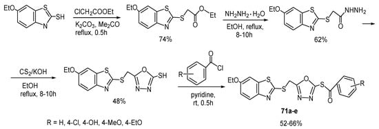 - Asrondkar, A.; Patil, V.; Mishra, N.; Bobade, A.S.; Chowdhary, A.S. Synthesis of some mercapto benzothiazole derivative with their characterization and biological evaluation. J. Pharm. Res. 2015, 4, 618–626. [Google Scholar]