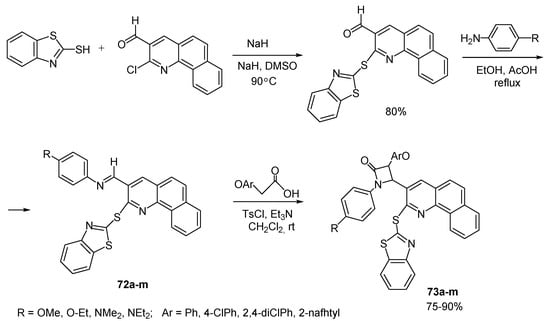 - Borazjani, N.; Jarrahpour, A.; Rad, J.A.; Mohkam, M.; Behzadi, M.; Ghasemi, Y.; Mirzaeinia, S.; Karbalaei-Heidari, H.R.; Ghanbari, M.M.; Batta, G.; et al. Design, synthesis and biological evaluation of some novel diastereoselective β-lactams bearing 2-mercaptobenzothiazole and benzoquinoline. Med. Chem. Res. 2019, 28, 329. [Google Scholar] [CrossRef]