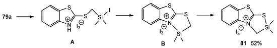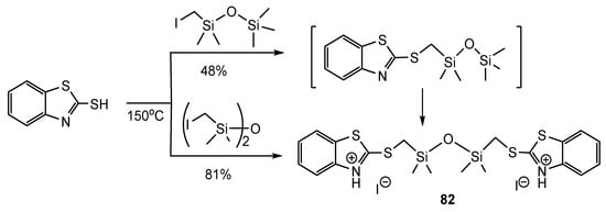 - Yarosh, N.O.; Zhilitskaya, L.V.; Shagun, L.G.; Dorofeev, I.A. Unusual Reaction of 1,3-Benzothiazole-2-thiol with Iodomethyl(dimethyl)phenylsilane in the Presence of Iodine. Russ. J. Org. Chem. 2018, 54, 1427–1429. [Google Scholar] [CrossRef]