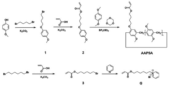 - Chi, X.D.; Yu, G.C.; Ji, X.F.; Li, Y.; Tang, G.P.; Huang, F. Redox-responsive amphiphilic macromolecular [2]pseudorotaxane constructed from a water-soluble pillar[5]arene and a paraquat-containing homopolymer. ACS Macro. Lett. 2015, 4, 996–999. [Google Scholar] [CrossRef]
