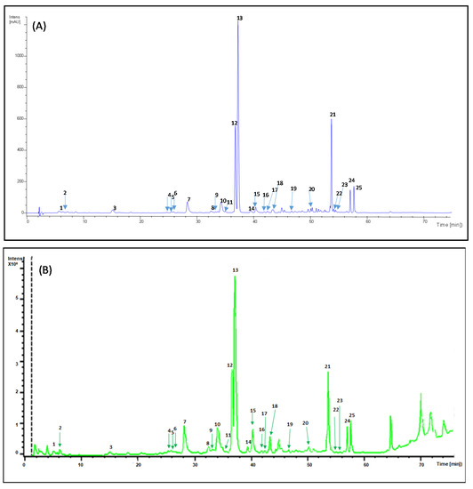 Figure 1A,B illustrate the HPLC-DAD-MS chromatograms of phenolic compounds of a B. globosa extract obtained with 80% methanol (soxhlet procedure). Peaks were identified with numbers (1–24) according to the elution order.