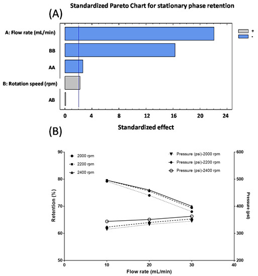 (A) Pareto chart showing the standardized effect of independent variables on the stationary phase retention response. (B) Effect of flow rate and rotation speed on stationary phase retention and backpressure.