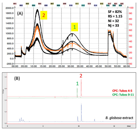 (A) CPC trace of Buddeja globosa extract. Inset: experimental stationary retention (SF); resolution (RS), and theoretical plates (N i,j) for target compounds 1 and 2 after pulse injection under optimal separation conditions. (B) HPLC of forsythoside B (1, green trace) and verbascoside (2, red trace) isolated from Buddleja globosa by CPC in ascending mode.