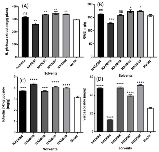 Effect of different NADESs on the extraction yields of B. globosa (A); Total Polyphenols (B); 7-O-glucoside (C), and verbascoside (D) from Buddleja globosa leaves. Data correspond to the means ± SD (n = 3). There is a significant difference when * p < 0.05; **p < 0.01; *** p < 0.001 or **** p < 0.0001 versus 80% methanol. Abreviation: ns: not significant.