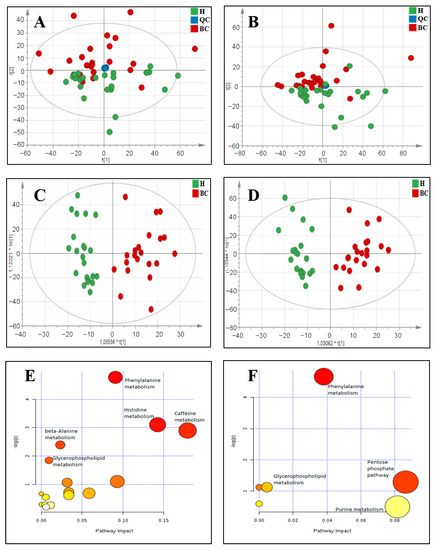 Observed differences in metabolic profiles of control and BC patients: (A) PCA score plot for positive ionization mode, with PC1 describing 12.8% of the variation and PC2 describing 5.5%, (B) PCA plot for negative ionization mode, with PC1 describing 13.6% of the variation and PC2 describing 5.5%, (C) Score plot of OPLS-DA model for positive ionization mode, with R2 = 85.2% and Q2 = 46%, (D) Score plot of OPLS-DA model for negative ionization mode, with R2 = 88.2% and Q2 = 43.3%, (E) Pathway analysis of differential metabolites in positive ionization mode, (F) Pathway analysis of differential metabolites in negative ionization mode.