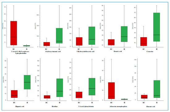 Box Whisker charts for selected compounds differentiating the studied groups (red (BC)—bladder cancer patients, green (H)—healthy volunteers).