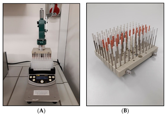 The high throughput 96-semi-automated SPME system used for analysis of urine samples (A) and a set of 96 SPME devices coated with different types of extraction phases (the PS-DVB coating selected for the study is represented in rows 3 and 4 from the right) (B).