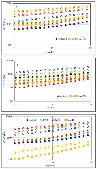 The structure of the dough based solely on swollen starch granules and non-starch hydrocolloids is much weaker than when gluten-containing flours are used; its consistency is more viscous and less elastic [5]. Therefore, new formulations and technological processes have been developed that could improve the structure, rheological properties, and gas-retaining properties of gluten-free dough, which could result in a well aerated, porous structure of bread crumb. The modifications of bread recipe, addition or replacement of some dough components, are usually connected with changes in the rheological characteristics of the dough, which could be monitored by viscoelastic properties. Gluten-free dough under small deformations behaves as a weak gel [20,21]. Basic methods that could be applied to describe its properties are sweep frequency and creep and recovery tests. Figure 1a,b demonstrate the changes in storage (G′) and loss (G″) moduli, reflecting the share of elastic and viscous characteristics, in relation to angular frequency for the control and gluten-free doughs in which 5, 10, or 15% of the starch mix was replaced with OSA starches II and III, respectively. Figure 1c represents a similar dependence for control and all samples in which the 15% replacement level was applied. In all the cases, the values of the storage modulus were higher than the loss modulus G′ > G″, which demonstrates the prevalence of elastic properties over viscous ones and confirms earlier results about the viscoelastic character of starch-based gluten-free dough [21,22].