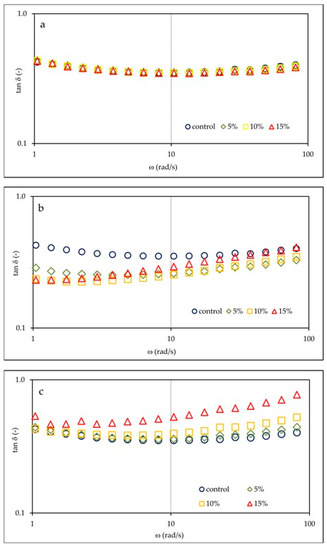 Changes in the tangent value of the phase shift angle (tan δ = G″/G′) relative to angular frequency for tested gluten-free dough samples with different OSA starch preparations are shown in Figure 2. In the case of OSA I starch (Figure 2a), due to a proportional increase in the value of G′ and G″, the values of the tan δ were not significantly different from each other and remained constant in relation to the angular frequency. The presence of OSA II starch in the dough (Figure 2b) clearly affected the decrease in tan δ value especially below 10 rad/s, which indicates a clear strengthening of the dough structure. On the other hand, the presence of OSA III starch (Figure 2c) resulted in an increase in the tan δ value, which was the greater the larger was the share of the additive, especially in the area of higher angular frequency values, indicating a significant weakening of the structure. These observations are consistent with the tan δ values at 1 Hz frequency (Table 1), which confirm that the doughs tested have characteristics of weak gels. The presence of OSA I or OSA III starch at lower concentrations did not have a significant effect on tan δ values at 1 Hz. On the other hand, the introduction of OSA II starch into the recipe significantly lowered the tan δ values at 1 Hz, indicating strengthening of the dough structure.