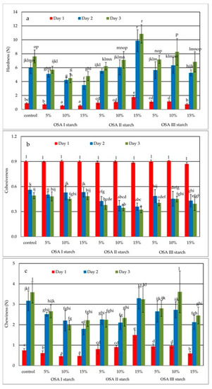 Effect of storage time on the texture parameters: hardness (a), cohesiveness (b), and (c) chewiness. OSA I starch—waxy corn starch sodium octenyl succinate; OSA II starch—pregelatinized waxy corn starch sodium octenyl succinate; OSA III starch—hydrolyzed and spray-dried waxy corn starch sodium octenyl succinate. a–l: Mean values assigned this same letter are non-significantly different at a 0.05 level of confidence.
