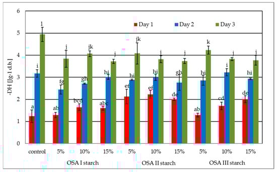 Effect of storage time on the enthalpy of amylopectin melting after the retrogradation of control gluten-free bread and breads with OSA starches. OSA I starch—waxy corn starch sodium octenyl succinate; OSA II starch—pregelatinized waxy corn starch sodium octenyl succinate; OSA III starch—hydrolyzed and spray-dried waxy corn starch sodium octenyl succinate. a–l: Mean values assigned this same letter are non-significantly different at a 0.05 level of confidence.